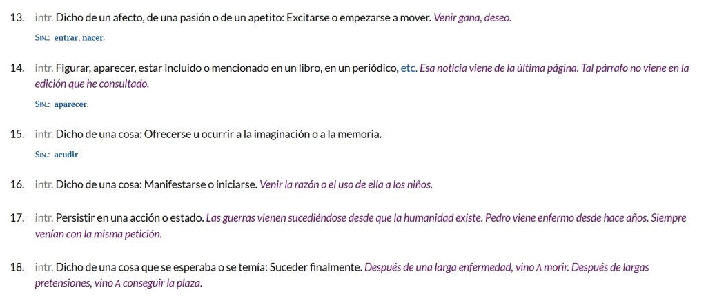 Decidí, entonces, buscar qué dice el Diccionario de la lengua española (DLE) y, a pesar de que registra más de 30 usos para la palabra «venir», ninguno es sinónimo de «eyacular». Las acepciones más parecidas a ese sentido son las que se muestran en la imagen de abajo, identificadas con el número 13 y con el número 18.